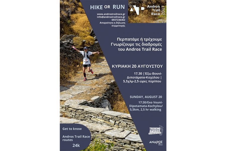Άλλοι περπατώντας και άλλοι τρέχοντας. Αυτή την Κυριακή, 20 Αυγούστου, θα περπατήσουμε και πάλι, ένα μέρος της Μεγάλης Κύριας Διαδρομής των 24χλμ., από το Έξω Βουνί έως και το χωριό Κοχύλου. Το τμήμα αυτό του αγώνα, συνδυάζει δύο διαδρομές του πεζοπορικού δικτύου Andros Route, την Νο 5 & Νο3 ενώ ένα μικρό κομμάτι 1χλμ, περνάει από ιδιωτική γη.