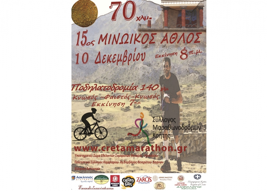 Σταθμοί ανεφοδιασμού για τον Μινωικό άθλο 70 χλμ: στο 7οχλμ. Μοίρες- 16ο Αρχαιολογικός Χώρος Γόρτυνας- 21χλμ. (που είναι και το πρώτο τσεκ αθλητών) -26χλμ στην διακλάδωση προς Μούλια-32 χλμ Αγία Βαρβάρα- Διακλάδωση προς Αγ. Θωμά-42χλμ(τσεκ μαραθωνίου) περιοχή Σίβας-50 χλμ διασταύρωση προς Δαφνές -54 χλμ διασταύρωση προς Αθάνατους-Γιόφυρος- Χανιόπορτα (εθνικό στάδιο Ηρακλείου)- Όαση- Μπεντεβή.
