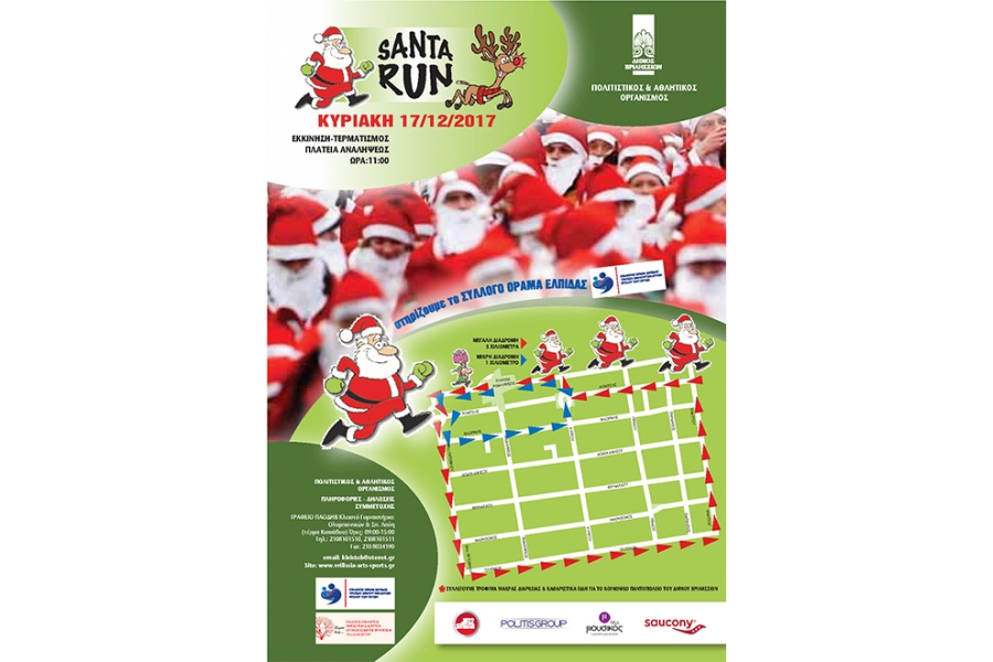 Ο αγώνας δρόμου θα ονομαστεί «Santa Run Βριλήσσια» και θα έχει κοινωνικό χαρακτήρα. Θα πραγματοποιηθεί την Κυριακή 17 Δεκεμβρίου 2017 και ώρα 11:00, με σημείο εκκίνησης και τερματισμού την Πλατεία Αναλήψεως. Θα συμμετάσχουν o σύλλογος ΟΡΑΜΑ ΕΛΠΙΔΑΣ,ο σύλλογος Εθελοντών Αιμοδοτών & Δωρητών Οργάνων Σώματος Βριλησσίων "Η ΑΛΛΗΛΕΓΓΥΗ", τα Σχολεία, οι Πολιτιστικοί και Αθλητικοί σύλλογοι της πόλης, ενήλικες και παιδιά από τα Βριλήσσια και από την ευρύτερη περιοχή.