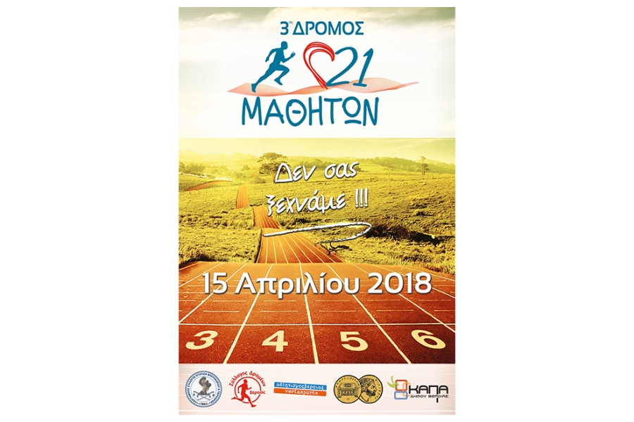 Ο Λαογραφικός Σύλλογος Ντόπιων Μακροχωρίου και Περιχώρων σε συνεργασία με το Αθλητικό τμήμα του Κ.Α.Π.Α Δήμου Βέροιας και την τεχνική υποστήριξη του τμήματος στίβου του Φιλλίπου Βέροιας και του Συλλόγου Δρομέων Βέροιας ανακοινώνουν την ημερομηνία διεξαγωγής του λαϊκού αγώνα 3ος ΔΡΟΜΟΣ 21 ΜΑΘΗΤΏΝ την Κυριακη 15 Απριλίου 2018,