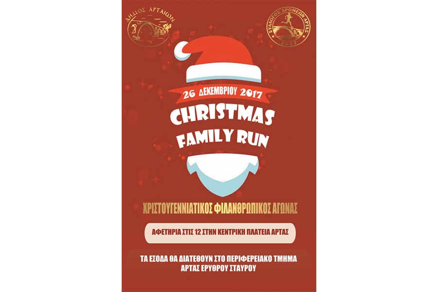 Την Τρίτη, 26 Δεκεμβρίου στις 12 το μεσημέρι συνδιοργανώνουμε με τον Δήμο Αρταίων μια οικογενειακή δρομική γιορτή! Ο γιορτινός μας αγώνας δε θα έχει ουσιαστικά αρχή και τέλος, δε θα έχει χρονομέτρηση, δε θα έχει μετάλλιο! Θα έχει όμως μπλουζάκι,αναμνηστικό,σε δύο χρώματα και σχέδια! Αυτή θα είναι και η συμμετοχή στον αγώνα! Τα χρήματα που θα συγκεντρώσουμε, θα τα διαθέσουμε στο τοπικό παράρτημα του Ερυθρού Σταυρού!