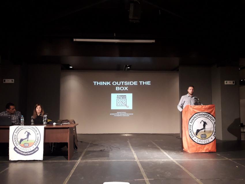 Οι δύο αθλητές ονόμασαν την παρουσία τους 'Think outside the box' ενώ παρουσίασαν τις εμπειρίες τους από τους αγώνες βουνού και ασφάλτου. Επίσης μίλησαν για την καλύτερη προετοιμασία για ένα μαραθώνιο ασφάλτου και έναν αγώνα βουνού και για τις διατροφικές συνήθειες πριν την προπόνηση αλλά και κατά τη διάρκεια αυτής.