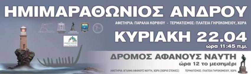 Ο Ημιμαραθώνιος Άνδρου, που τελεί υπό την αιγίδα της ΕΟΣΛΜΑΥ, έχει σημείο εκκίνησης την παραλία του Όρμου Κορθίου και τερματισμό την Πλατεία Γηροκομείου στη Χώρα της Άνδρου και θα πραγματοποιηθεί την Κυριακή, 22 Απριλίου 2018, με ώρα εκκίνησης 11:45 π.μ. Παράλληλα, όπως και πέρυσι, διοργανώνεται ο Αγώνας Δρόμου Αφανούς Ναύτη, με αφετηρία την πλατεία του Αφανούς Ναύτη και τερματισμό την Πλατεία Γηροκομείου στη Χώρα, ενώ η πανέμορφη διαδρομή που ακολουθούν οι αθλητές διέρχεται μέσα από γραφικά χωριά του νησιού μας. Ο αγώνας αυτός θα διεξαχθεί την ίδια ημέρα, Κυριακή 22 Απριλίου 2018 και ώρα 12:00 π.μ.