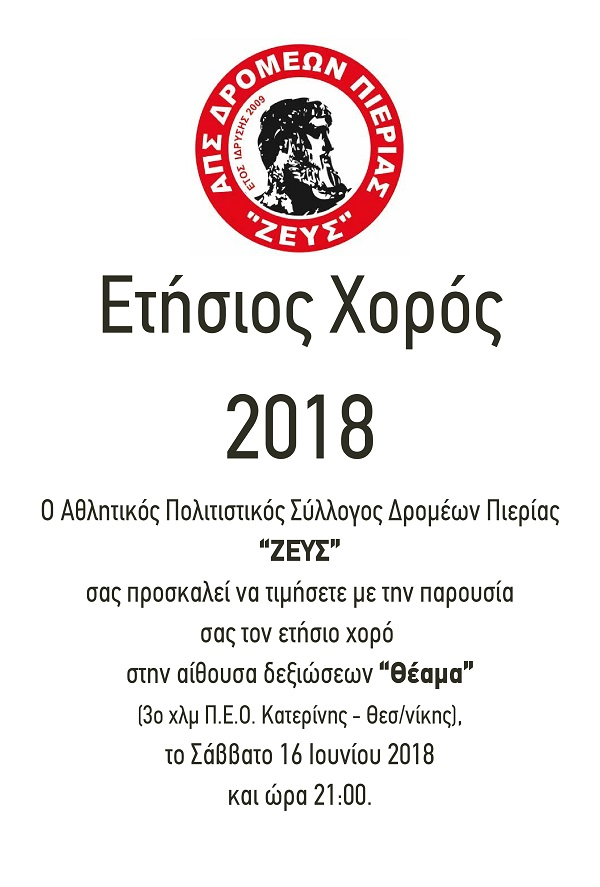 Ο Αθλητικό Πολιτιστικός Σύλλογος Δρομέων Πιερίας "ΖΕΥΣ" σας προσκαλεί να τιμήσετε με την παρουσία σας τον ετήσιο χορό στην αίθουσα δεξιώσεων "Θέαμα", το Σάββατο 16 Ιουνίου 2018 και ώρα 21:00.
