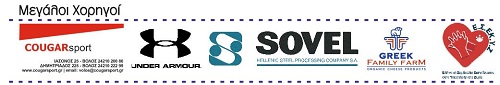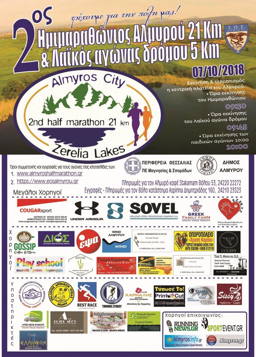 Μεγάλοι Χορηγοί: Τα καταστήματα αθλητικών ειδών COUGARsport και η εταιρεία αθλητικών ειδών UNDER ARMOUR οι οποίοι θα "ντύσουν" τους δρομείς του αγώνα των 21Km! Η βιομηχανία SOVEL S.A. (χαλυβουργείο, ελασματουργείο) του Αλμυρού! Η GREEK FAMILY FARM/ΚΤΗΝΟΤΡΟΦΙΚΗ ΜΑΓΝΗΣΙΑΣ Α.Ε. (τυροκομείο-βιολογικά προϊόντα) του Αλμυρού & τέλος το ΕΛΛΗΝΙΚΟ ΣΥΜΒΟΥΛΙΟ ΕΚΠΑΙΔΕΥΣΗΣ στην ΥΠΟΣΤΗΡΙΞΗ της ΖΩΗΣ!