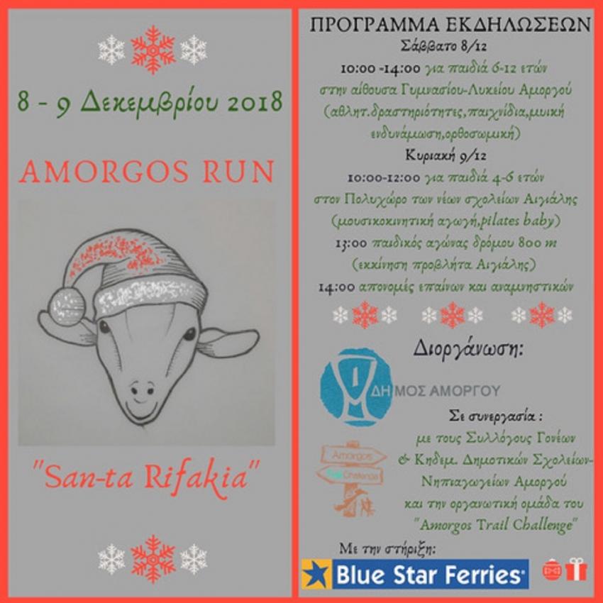Σας ενημερώνουμε ότι ο Δήμος Αμοργού (και συγκεκριμένα η Δημ.Κοινωφελής Επιχ.Αμοργού)σε συνεργασία με όλους τους συλλόγους Γονέων και Κηδεμόνων Δημοτικών και Νηπιαγωγείων Αμοργού και με την οργανωτική ομαδα του Amorgos Trail Challenge διοργανώνει Αθλητικό Χριστουγεννιάτικο διήμερο στις 8 & 9 Δεκεμβρίου 2018 για όλα τα παιδιά του νησιού ηλικίας 4-12 ετών. Η Blue Star Ferries στηρίζει αυτήν την συλλογική προσπάθεια!