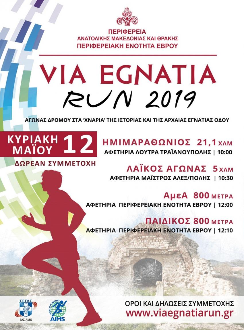 Ο αγώνας δρόμου «VIA EGNATIA RUN» αποτελεί μια καινοτόμο δράση της Περιφερειακής Ενότητας Έβρου – Περιφέρειας Ανατολικής Μακεδονίας και Θράκης που με «αφετηρία» το παρελθόν, μας «ταξιδεύει» στο παρόν και στο μέλλον αυτού του τόπου. Η ύπαρξη ενός δρομικού αγώνα με υψηλά ποιοτικά χαρακτηριστικά, δίνει μια διαφορετική προσέγγιση στους αγώνες μεγάλων αποστάσεων, για τους δρομείς, και όλους τους συμμετέχοντες. Η ιδέα «γεννήθηκε» το 2016 ως σημείο αναφοράς που καλύπτει διαχρονικά και βιωματικά την ιστορία και τον πολιτισμό της Αρχαίας Εγνατίας Οδού. Στόχος είναι να διασχίσει και να «αγγίξει» όλη την αρχαία Εγνατία Οδό και μέσω του αθλητισμού να προσεγγίσουμε τη διαδρομή που ένωσε στο παρελθόν την Κωνσταντινούπολη με τη Ρώμη πολιτισμικά, οικονομικά, εμπορικά. Η Εγνατία Οδός ένωσε και έφερε κοντά τους πολίτες στο παρελθόν και μπορεί να μας οδηγήσει και στο μέλλον.