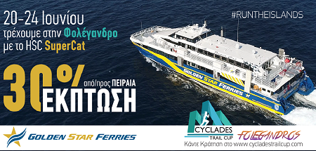 Για τις μετακινήσεις των αθλητών και επισκεπτών από και προς το νησί της Φολεγάνδρου, η διοργανώτρια αρχή σε συνεργασία με την ακτοπλοϊκή εταιρία GOLDEN STAR FERRIES προσφέρει έκπτωση 30% στα ατομικά εισιτήρια του ταχύπλοου: “HSC SUPERCAT”. Για την κράτηση/αγορά των εισιτηρίων, αφού οι αθλητές έχουν καταχωρήσει τη συμμετοχή τους στην οργάνωση, θα πρέπει να καλέσουν σε έναν από τους κάτωθι 2 ταξιδιωτικούς συνεργάτες για την έκδοση των ακτοπλοϊκών: