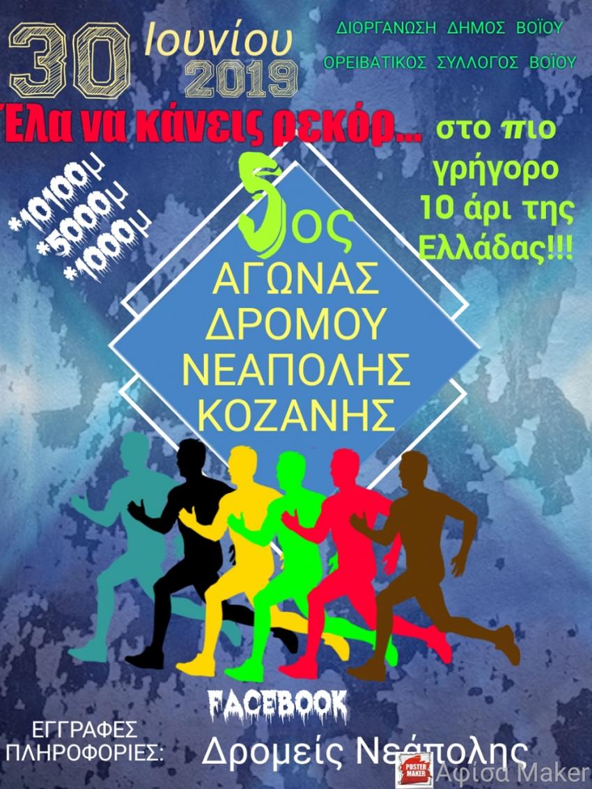 Ο Δήμος Βοΐου και ο Ορειβατικός σύλλογος Βοΐου «Προφήτης Ηλίας» σε συνεργασία με τους συλλόγους της Νεάπολης διοργανώνουν τον 5ο αγώνα Νεάπολης Κοζάνης 10100 μ την Κυριακή 30 Ιουνίου 2019. Παράλληλα θα διεξαχθεί αγώνας δρόμου 5 χλμ και παιδικός αγώνας 1 χλμ.