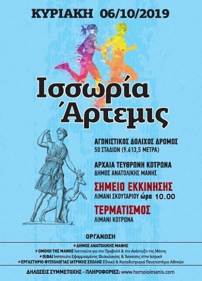Το Μεταπτυχιακό Πρόγραμμα Σπουδών στη «Μοριακή & Εφαρμοσμένη Φυσιολογία», Ιατρική Σχολή, Εθνικό & Καποδιστριακό Πανεπιστήμιο Αθηνών (ΕΚΠΑ), ο Δήμος Ανατολικής Μάνης, το Ινστιτούτο για την προβολή και την ανάπτυξη της Μάνης «Όμοιοι της Μάνης» και το Ινστιτούτο «Εφαρμοσμένης Φυσιολογίας & Άσκησης στην Ιατρική» (Ι.Ε.Φ.Α.Ι) προκηρύσσουν για δεύτερη χρονιά τον αγώνα δρόμου με την επωνυμία «Ισσωρία Άρτεμις 2019» - Αγωνιστικός Δόλιχος Δρόμος 50 σταδίων που περιλαμβάνει μια διαδρομή 50 σταδίων (9.613,5 μέτρων) ανάμεσα στους λιμένες Σκουταρίου και Κότρωνα στο Δήμο Ανατολικής Μάνης, Λακωνία.