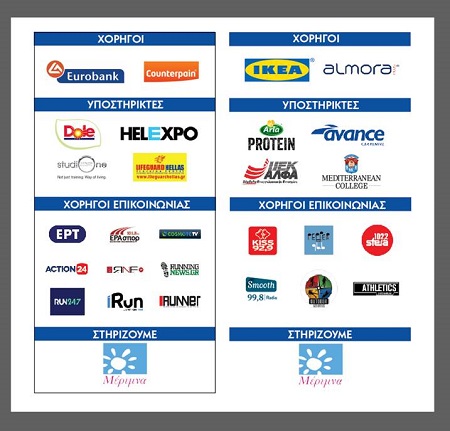 Χορηγοί της διοργάνωσης η EUROBANK, τα ΙΚΕΑ, η Counterpain και η Arla Protein, Υποστηρικτές το ΙΕΚ ΑΛΦΑ, το Mediterranean College, η AVANCE Car Rental, η Lifeguard Hellas, η Micro Scooters και το Studio ONE,.