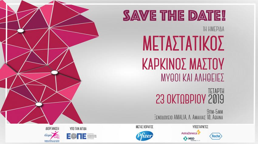 Την Τετάρτη 23 Οκτωβρίου 2019 ο Πανελλήνιος Σύλλογος Γυναικών με Καρκίνο Μαστού «Άλμα Ζωής» σας προσκαλεί στην ανοιχτή ημερίδα «Μεταστατικός καρκίνος μαστού: Μύθοι και αλήθειες». Η ημερίδα θα πραγματοποιηθεί από τις 9πμ έως τις 5μμ στο ξενοδοχείο Amalia, λεωφ. Αμαλίας 10, Αθήνα.