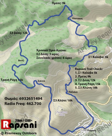 Ο Rapsani Trail είναι 21χλμ και ακολουθεί μία μικτή πορεία. Ο αγώνας ξεκινάει από την πλατεία του χωριού στα 500μ υψόμετρο μέσα από τους μύλους του Παζιάνα για να περάσει πάνω από την Κρανιά όπου και ο βοηθητικός σταθμός ανεφοδιασμού με νερό στο 5χλμ. Συνεχίζουμε μέσα από το Ελατόδασος, το ρέμα του Χάντακα, το σταθμό ελέγχου Πρέος μέχρι την Δέση όπου και ο κύριος σταθμός ανεφοδιασμού στα 12χλμ. Από εκεί ανεβαίνουμε πλέον στο υψηλότερο σημείο της διαδρομής, στην Τρανή ράχη στα 1250μ, ένα ιστορικό συνοριακό παρατηρητήριο της περιοχής. Προχωράμε για τον τερματισμό αφού περάσουμε το Σιποτό για τον σταθμό Αλώνι στο 18χλμ ώσπου να καταλήξουμε πίσω στην πλατεία του χωριού. Στο σύνολό της αποτελείται από 1χλμ άσφαλτο, 3χλμ χωμάτινο δρόμο, 3χλμ δασικό δρόμο και 14χλμ σε μονοπάτι με συνολικά υψομετρικά ανάβασης στα 1200μ. Μέτριας δυσκολίας διαδρομή με ένταση στα σημεία με κύριο σταθμό ανεφοδιασμού την Δέση στο 10χλμ.8.