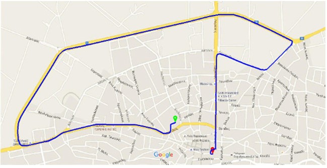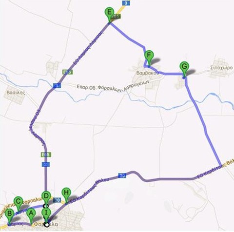 Εκκίνηση → Φάρσαλα, Πηγές Απιδανού ποταμού → οδός Θέτιδος προς Λαμία → οδός Λαμίας → Αρχαϊκός Θολωτός Τάφος → δεξιά οδός Αθηνών → οδός Λαρίσης, αριστερά προς Λάρισα (Πεδιάδα των Φαρσάλων – Σιδηροδρομική Γραμμή – Βασιλί – Γέφυρα Ενιπέα – Δενδράκια) → μετά το εργοστάσιο “ΕΠΙΛΕΚΤΟΣ” δεξιά προς Βαμβακού → Βαμβακού → Ρευματιά → Ρευματιά (τελευταίος δρόμος δεξιά) → οδός Βόλου – Φαρσάλων → οδός Βόλου – Φαρσάλων δεξιά προς Φάρσαλα → Φάρσαλα, οδός Βόλου → οδός Θέτιδος δεξιά → οδός Λαρίσης αριστερά → Τερματισμός Πλατεία Δημαρχείου – Άγαλμα Αχιλλέα.