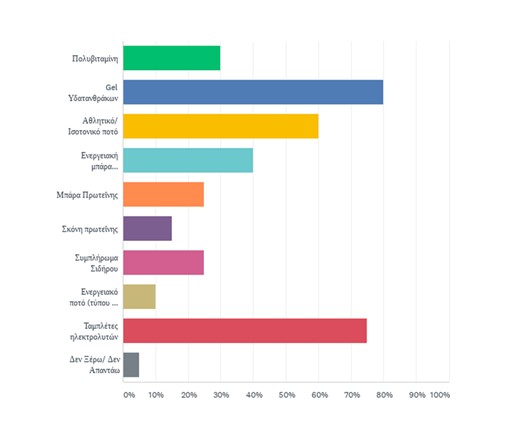 Τα gel υδατανθράκων και οι ταμπλέτες ηλεκτρολυτών είναι τα πιο δημοφιλή συμπληρώματα διατροφής. Η λίστα των συμπληρωμάτων διατροφής που καταναλώνονται είναι