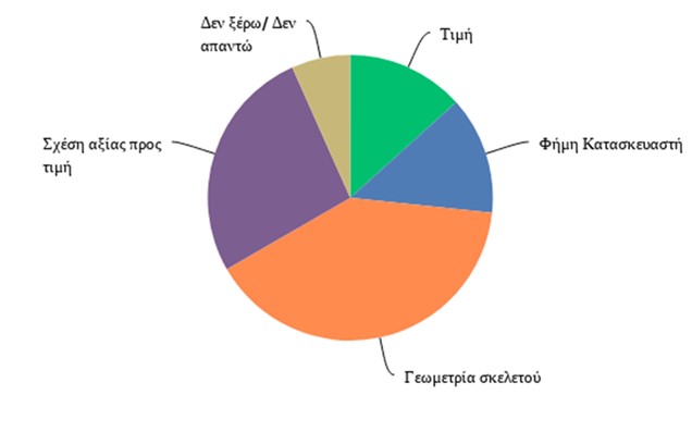 Ως βασικό κριτήριο αγοράς του ποδηλάτου δεν είναι η τιμή ή η φήμη του κατασκευαστή αλλά η γεωμετρία του σκελετού (40%) και δεύτερο κριτήριο έρχεται η σχέση ποιότητας προς τιμή (26,67%).