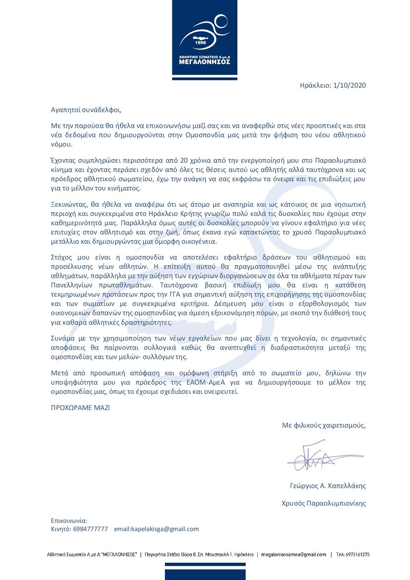 Ο Γιώργος Καπελλάκης, Χρυσός Παραολυμπιονίκης ανακοίνωσε την υποψηφιότητά του για την προεδρία της ομοσπονδίας.