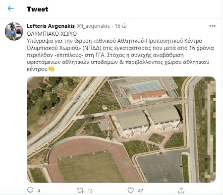 Ο Υφυπουργός Πολιτισμού και Αθλητισμού, κ. Λευτέρης Αυγενάκης υπέγραψε για την ίδρυση του Ν.Π.Δ.Δ. «Εθνικό Αθλητικό - Προπονητικό Κέντρο Ολυμπιακού Χωριού».