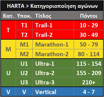 Ο κάθε αγώνας κατατάσσεται με βάση το μέγεθός του, όπως αυτό προκύπτει από τον μαθηματικό τύπο μετατροπής της ανάβασης σε μήκος (το 1/100 της ανάβασης μετατρέπεται σε μήκος και αθροίζεται στο πραγματικό μήκος, πχ: αγώνας 50Κ με +4000m = 50+40=90). Δημιουργούνται 4 κατηγορίες αγώνων σύμφωνα με τη HARTA: 1) Trail, 2) Marathon, 3) Ultra, 4) Vertical. Ο κάθε αγώνας ταξινομείται σε μία από τις τέσσερις παραπάνω κατηγορίες.