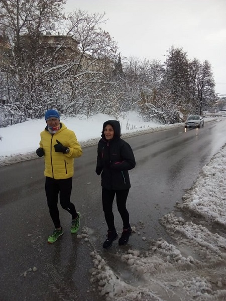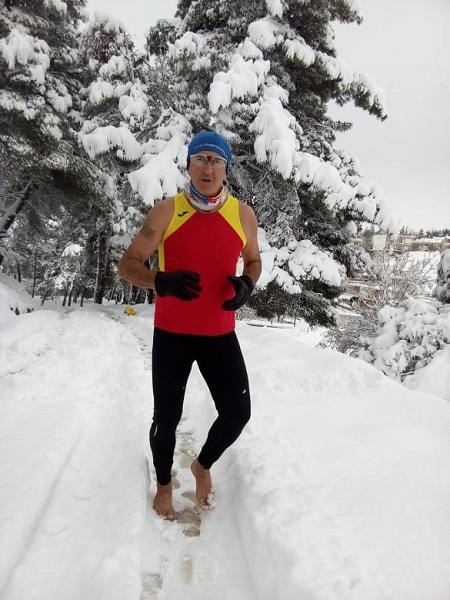 Οι δρομείς Θήβας τόλμησαν να «κοντράρουν» την κατά το μύθο παιδοκτόνο… Πήραν τους δρόμους όπως εμφαίνεται στις φωτό. Αψήφησαν την χαμηλή θερμοκρασία και τις συστάσεις περί εγκλεισμού. Η 66χρονη Μαργαρίτα Παναγοπούλου και ο 55χρονος Γιάννης Γερονικολός διάλεξαν τη διαδρομή προς το Μοσχοπόδι… Από ένα σημείο και μετά ο Γιάννης έγινε ακραίος. Ετρεξε επάνω στο χιόνι ανυπόδυτος!!! Ετσι αγωνίζεται συνήθως γιατί ακολουθεί τις ιατρικές οδηγίες για την αντιμετώπιση της πελματιαίας απονεύρωσης…Όταν μετέχει σε υπερ – απόσταση ή σε αγώνα χωμάτινο χρησιμοποιεί ειδικά πέδιλα. Η κα Μαργαρίτα, μια από τις ταχύτερες μαραθωνοδρόμους των ηλικιών +60, δεν είχε λόγο να ακολουθήσει…