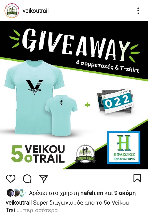 Όσο εσύ σκέφτεσαι σε ποια διοργάνωση θα πας, αν και η επιλογή είναι πολύ εύκολη, τα ΗΦΑΙΣΤΟΣ σιδερωτήρια έρχονται και σου χαρίζουν 4 πλήρη πακέτα συμμετοχής (Συμμετοχή + T-shirt) για το 5ο Veikou Trail και σου δίνουν την δυνατότητα ¨να τρέξεις στο βουνό μέσα στην πόλη¨