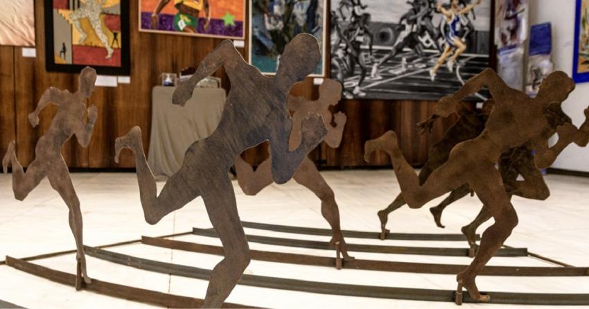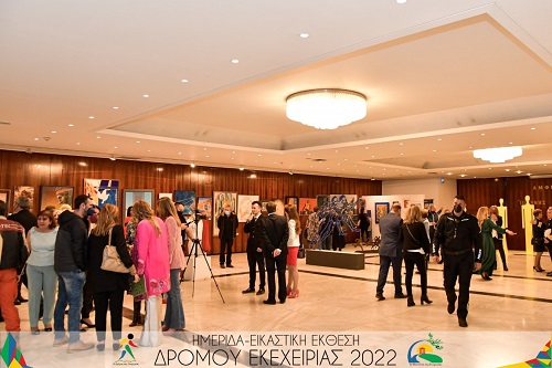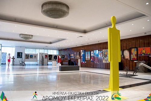 Η Ιστορικός της Τέχνης & Επιμελήτρια της εικαστικής έκθεσης, που παρουσιάστηκε στο Φουαγιέ του Μουσείου, κα Αννίτα Πατσουράκη αναφέρθηκε στο περιεχόμενο και τους καλλιτέχνες της έκθεσης με τίτλο: «Εὐοῖ ὠκύποδα!» (Εύγε γοργοπόδαρε!), τονίζοντας ότι οι 56 συμμετέχοντες καλλιτέχνες με ποικιλία εκφράσεων, συνευρέθηκαν σε κοινό διάλογο δημιουργικού πνεύματος και κοινών οραμάτων, εκεί όπου γίνονται κατανοητές οι πανανθρώπινες έννοιες, συντελώντας ως αναπόσπαστο κομμάτι της πολιτιστικής μας κληρονομιάς. Με εφαλτήριο τη μοναδικότητα της ιστορίας μας και της πολιτιστικής μας μνήμης, έχοντας παρακαταθήκη αξιών εμπνευσμένη από το πνεύμα που μεταλαμπαδεύει ο ολυμπισμός σε ολόκληρο τον κόσμο, με γνώση της ιστορίας και τον πνευματικό θησαυρό της τέχνης και του πολιτισμού μας, έπλασαν όμορφα ιδανικά διαχρονικής πορείας.