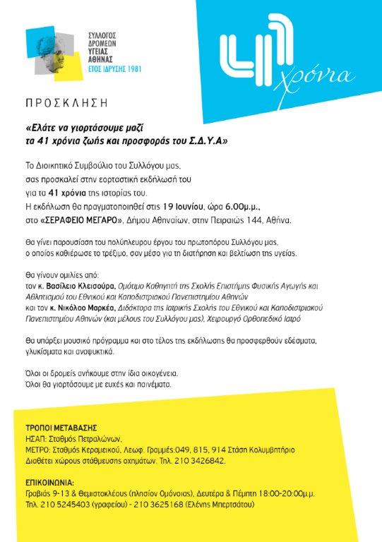 Πρόσκληση Δ.Σ. ΣΔΥΑ στην εορταστική εκδήλωση για τα 41 χρόνια της ιστορίας του