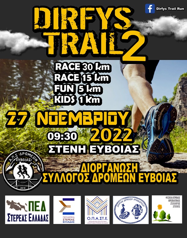 Ο Αθλητικός Πολιτιστικός Σύλλογος ΔΡΟΜΕΩΝ ΕΥΒΟΙΑΣ ανακοινώνει την διοργάνωση του 2ου αγώνα ορεινού τρεξίματος με την επωνυμία <<Dirfys Trail Run>> που θα γίνει την Κυριακή 27 Νοεμβρίου 2022 στη Στενή ΕΥΒΟΙΑΣ