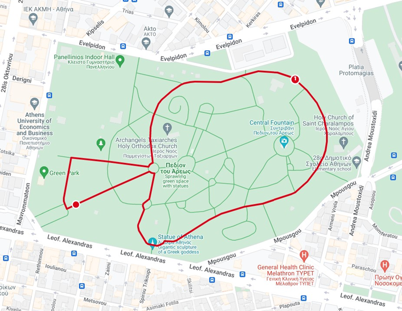 Εκκίνηση από το άγαλμα της Κωνσταντίνου, πρώτη στροφή δεξιά, πέρασμα από το άγαλμα της Αθηνάς, τον Αγ. Χαράλαμπο, τους Αγ. Ταξιάρχες, δεξιά στο δρόμο με τις προτομές των Ηρώων του 1821, αριστερά στον χωμάτινο δρόμο και έξοδος στο σημείο εκκίνησης. Με 3 στροφές θα καλυφθούν τα 5 χιλιόμετρα.