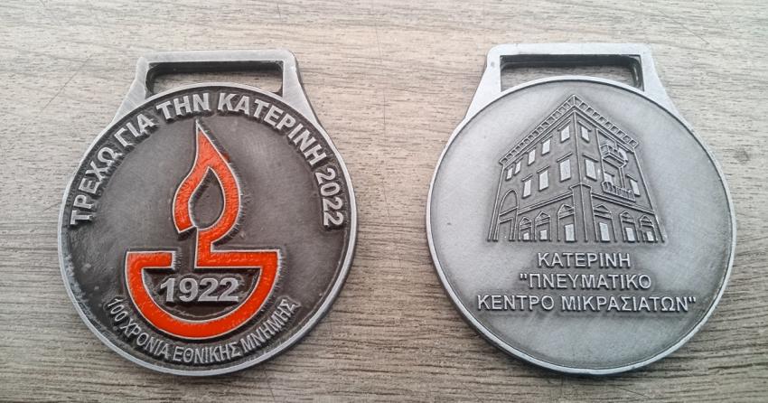 Όπως ήδη έχει ανακοινωθεί, επειδή το 2022 είναι έτος με ιδιαίτερο συναισθηματικό φορτίο για τους απανταχού Έλληνες, καθώς συμπληρώνονται 100 χρόνια από το βίαιο ξεριζωμό του μικρασιατικού ελληνισμού από τις πατρογονικές του εστίες, ο Δήμος Κατερίνης και ο Οργανισμός Πολιτισμού (ΟΠΠΑΠ), μέσω της ετήσιας κορυφαίας αθλητικής – πολιτιστικής γιορτής: «ΤΡΕΧΩ ΓΙΑ ΤΗΝ ΚΑΤΕΡΙΝΗ», τιμούν την ιστορική επέτειο, με την αποτύπωση στη μία όψη του πρωτότυπου μεταλλίου, του λογοτύπου: «1922 - 100 χρόνια Εθνικής Μνήμης».