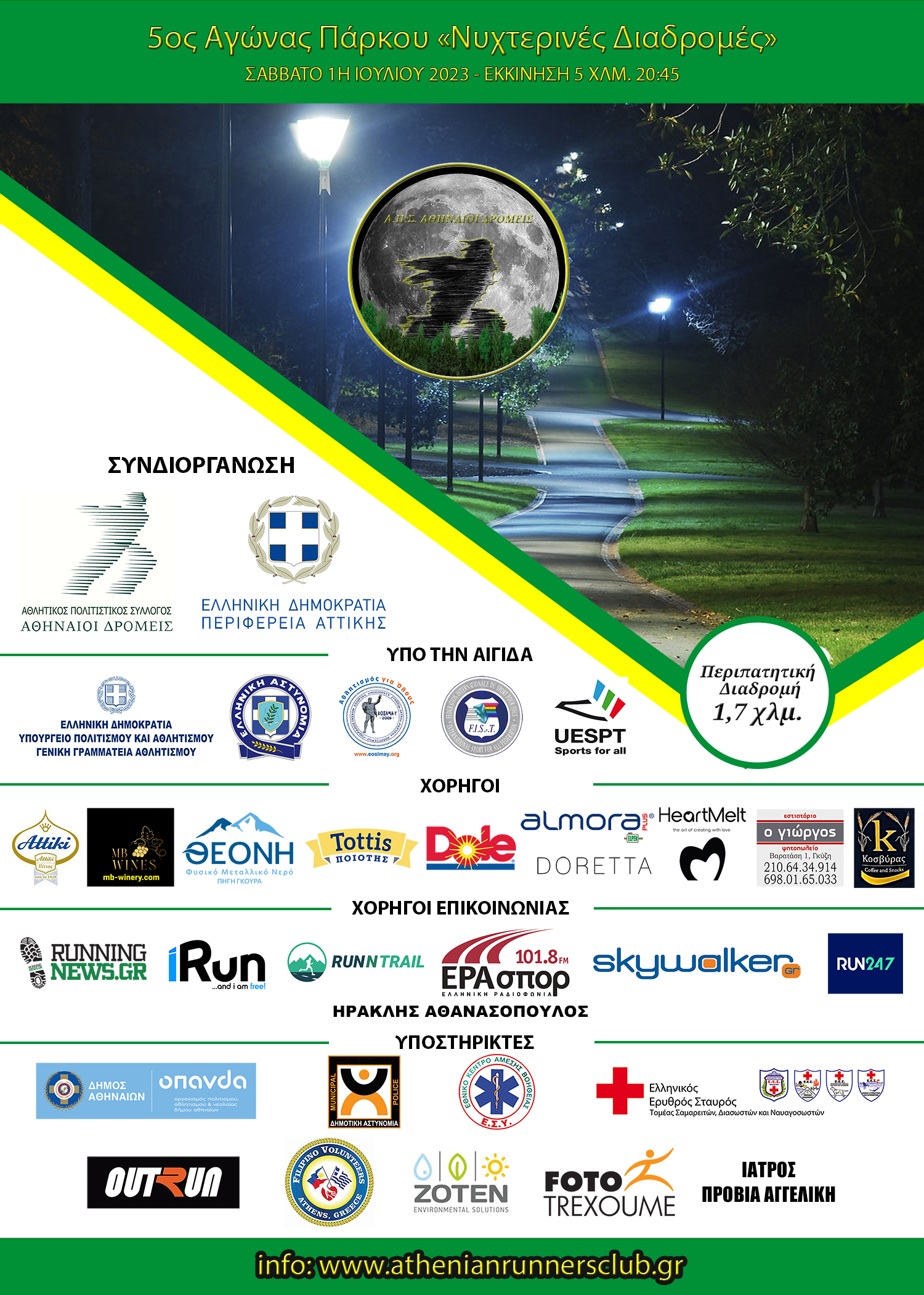 Ο 5ος Αγώνας Πάρκου «Νυχτερινές Διαδρομές» ανήκει στο κοντινό παρελθόν, η ανάμνηση της όμορφης γιορτής όμως, στη σκέψη όλων παραμένει ζωντανή, Ο Α.Π.Σ. Αθηναίοι Δρομείς κατέβαλε κάθε δυνατή προσπάθεια και το αποτέλεσμα μας γέμισε ικανοποίηση.
