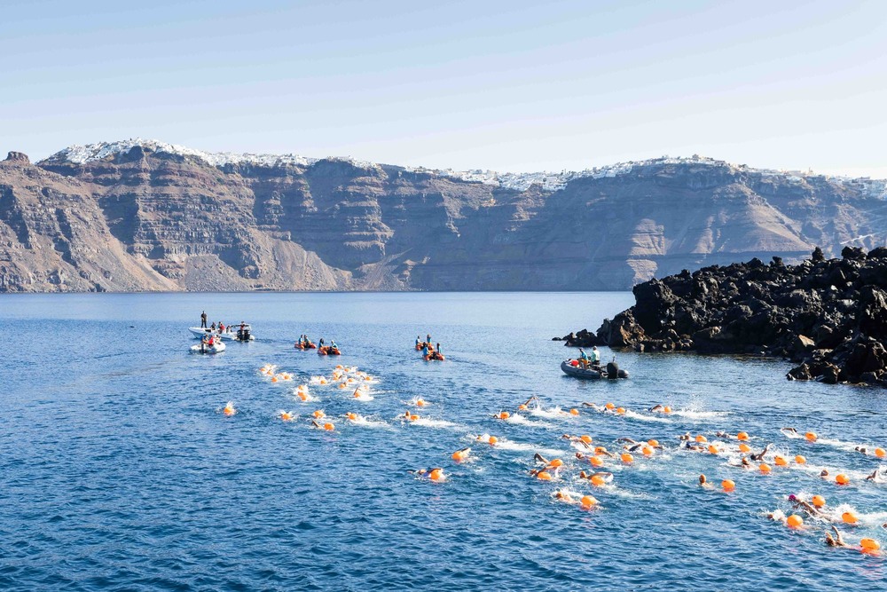 Στο πρόγραμμα ξεχωρίζει ο εμβληματικός αγώνας open water κολύμβησης, απόστασης 1,5 μιλίου (2,4 χλμ), όπου οι αθλητές θα ξεκινήσουν από το Ηφαίστειο και θα τερματίσουν στο παλιό λιμάνι των Φηρών διασχίζοντας τα νερά του Αιγαίου με βάθος που φτάνει μέχρι και τα 400 μέτρα, ειδικά στη μέση της Καλντέρας, με φόντο το εντυπωσιακό τοπίο της Σαντορίνης. Ο σχεδιασμός της διαδρομής φέρει την υπογραφή του Νίκου Γέμελου, κορυφαίου τεχνικού διευθυντή με Ολυμπιακές και παγκόσμιες διακρίσεις στην κολύμβηση, ενώ η ασφάλεια των συμμετεχόντων εξασφαλίζεται από μια εξειδικευμένη ομάδα ναυαγοσωστών και ναυαγοσωστικών σκαφών και όλοι οι κολυμβητές θα φορούν σωσίβιο ασφαλείας. Επιπλέον, οι συμμετέχοντες δικαιούνται δωρεάν χρήση του τελεφερίκ (άνοδο και κάθοδο) με την επίδειξη της πληρωμένης συμμετοχής τους.