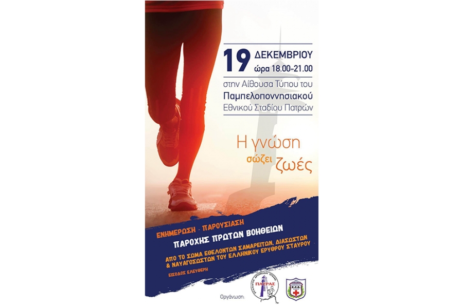 O Σύλλογος Δρομέων Υγείας Πάτρας σε συνεργασία με τοΣώμα Εθελοντών Σαμαρειτών, Διασωστών και Ναυαγοσωστών του Ελληνικού Ερυθρού Σταυρούδιοργανώνουν ημερίδα Ενημέρωσης – Παρουσίασης Παροχής Πρώτων Βοηθειών, για να τονιστεί η σπουδαιότητα των Πρώτων Βοηθειών σε καταστάσεις έκτακτης ανάγκης, αλλά και στην καθημερινότητα, εκεί όπου η έγκαιρη και σωστή παρέμβαση μπορεί να αποτρέψει μια αναπηρία ή να σώσει μια ζωή.