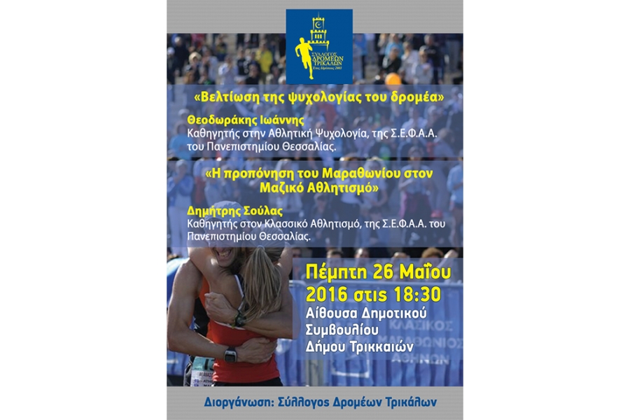 Η εκδήλωση υλοποιείται από το Σύλλογο Δρομέων Τρικάλων, λίγες ημέρες πριν το κλείσιμο των εγγραφών του 34ουΑυθεντικού Μαραθώνιουτης Αθήνας και των παράλληλων αγώνων 5 και 10 χλμ . Οι ομιλίες έχουν ως στόχο να ενημερώσουν τα μέλη και τους φίλους του Συλλόγου σε θέματα σχετικά με την ψυχολογία και τον τρόπο προπόνησης του δρομέα για τα αγωνίσματα αντοχής. Η συμμετοχή στην εκδήλωση είναι ελεύθερη για όποιον επιθυμεί να την παρακολουθήσει.