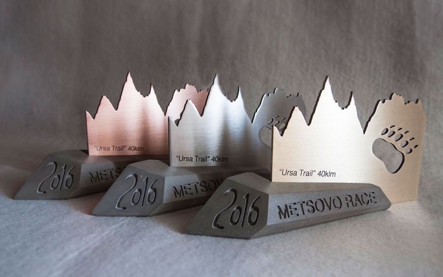 Και ο Ηλίας Τσώλης για το μετάλλιο: «Το μετάλλιο του αγώνα ήθελα να έχει άμεση σχέση με το έπαθλο του αγώνα, κινούμενο στην ίδια αισθητική. Χρησιμοποιήθηκαν τα ίδια στοιχεία, δηλαδή η γραμμή της υψομετρικής διαφοράς και το μπροστινό πάτημα της αρκούδας, καθώς και η ίδια γραμματοσειρά για το METSOVO RACE 2016. Δούλεψα το μετάλλιο σε δύο επίπεδα-επιφάνειες, το πρώτο επίπεδο, πιο φωτεινό, ανοιχτόχρωμο και γυαλισμένο, και το δεύτερο, που λειτουργεί σαν φόντο για την “κορυφογραμμή” και σαν γέμισμα για το πάτημα και τα γράμματα».