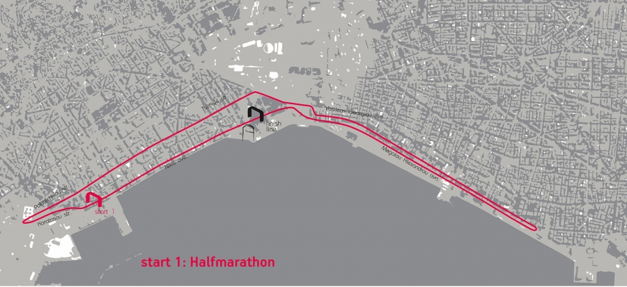 Η εκκίνηση του Ημιμαραθωνίου θα δοθεί στις 18:45, με τη δύση του ήλιου, επί της οδού Ναυάρχου Κουντουριώτου, στον ΟΛΘ. Η διαδρομή θα εκτείνεται έως το τέλος της Λεωφόρου Μεγάλου Αλεξάνδρου, η οποία θα είναι χωρισμένη σε δύο διαζώματα προκειμένου οι δρομείς να μπορούν να κάνουν επιτόπια αναστροφή. Κατόπιν θα κινηθούν διαδοχικά επί των οδών Γ’ Σεπτεμβρίου, Ανδρονίκου, Τσιμισκή και Πολυτεχνείου, θα μπουν στην Καρατάσου με στροφή 180 μοιρών και θα βρεθούν ξανά στη Ναυάρχου Κουντουριώτου, ολοκληρώνοντας την πρώτη στροφή. Οι δρομείς θα διανύσουν την παραπάνω διαδρομή δύο φορές, για να τερματίσουν κινούμενοι επί της Λεωφόρου Νίκης, μπροστά στον Λευκό Πύργο.