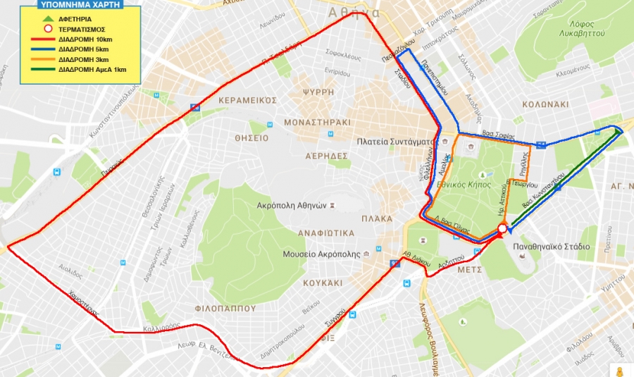 1 χλμ.: ΑμεΑ: Πινακοθήκη (κόμβος Hilton) – αντίθετη κίνηση δρομέων προς το Καλλιμάρμαρο – Καλλιμάρμαρο (τερματισμός)