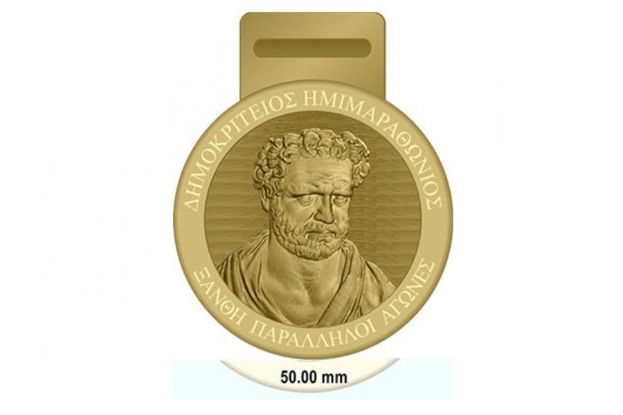 Πρόκειται για ένα πολύ εντυπωσιακό εικαστικού χαρακτήρα μετάλλιο, βαρύτιμο, διαμέτρου 5 εκατοστών και πάχους 3 χιλιοστών. Στην μπροστινή του όψη στο περίγραμμα του μεταλλίου είναι αποτυπωμένος ο επίσημος λογότυπος της διοργάνωσης και στο κέντρο του απεικονίζεται περίτεχνα το κεφάλι του Δημόκριτου, του προσωκρατικού φιλοσόφου, ο οποίος γεννήθηκε και έζησε στα Άβδηρα του Νομού Ξάνθης και του οποίου το όνομα φέρει η διοργάνωση. Στην πίσω όψη του, είναι αποτυπωμένο το λογότυπο και το σύμβολο του Συλλόγου Δρομέων Ξάνθης. Το μετάλλιο επίσης συμπεριλαμβάνει και την κορδέλα λαιμού, με τύπωμα σατέν, πάχους 25 χιλιοστών.