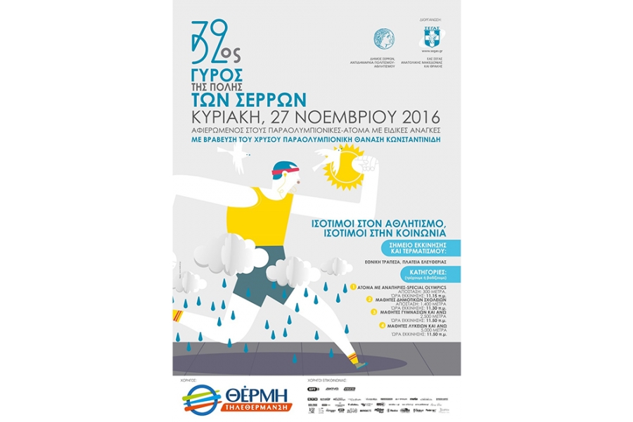 Φέτος ο «Γύρος της Πόλης των Σερρών» είναι αφιερωμένος στους Παραολυμπιονίκες – Άτομα με Ειδικές Ανάγκες (Α.Μ.Ε.Α.) και κεντρικό σύνθημα «Ισότιμοι στον αθλητισμό, ισότιμοι στην κοινωνία».