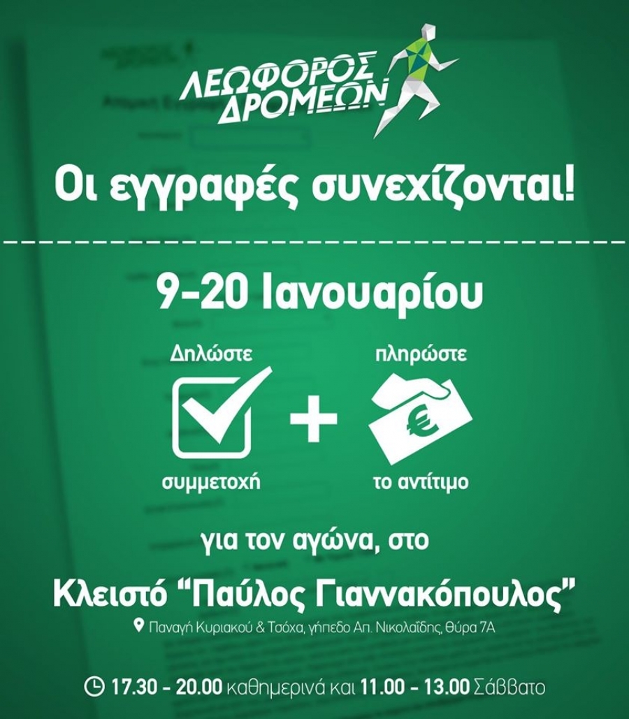 Περίπου ένας μήνας απομένει για τον πρώτο αγώνα Λεωφόρος Δρομέων και από τη Δευτέρα 9 Ιανουαρίου έως την Παρασκευή 20 του μηνός, έχετε την ευκαιρία να εγγραφείτε και να πληρώσετε το αντίτιμο του αγώνα την ίδια στιγμή, στο κλειστό "Παύλος Γιαννακόπουλος" στη Λεωφόρο Αλεξάνδρας!