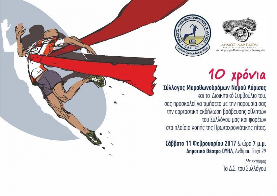 Ο Σύλλογος Μαραθωνοδρόμων Νομού Λάρισας, ενημερώνει ότι θα πραγματοποιήσει εκδήλωση βραβεύσεων και κοπή Πρωτοχρονιάτικης πίτας το Σάββατο 11 Φεβρουαρίου 2017 και ώρα 19:00 στο Δημοτικό Θέατρο ΟΥΗΛ. Η εκδήλωση είναι η πρώτη από μια σειρά εκδηλώσεων με αφορμή τη συμπλήρωση 10 χρόνων από την ίδρυση του Συλλόγου και θα πραγματοποιηθεί σε συνεργασία με την Αντιδημαρχία Πολιτισμού και Επιστημών του Δήμου Λαρισαίων. Ο Σύλλογος Μαραθωνοδρόμων Νομού Λάρισας στα 10 αυτά χρόνια προσέφερε στην ανάπτυξη του μαζικού αθλητισμού τόσο στο νομό Λάρισας όσο και σε πανελλαδικό επίπεδο γενικότερα, ενώ έχει αναπτύξει και πλούσια κοινωνική δράση με την οικονομική στήριξη ευαγών ιδρυμάτων μέσα από τις δράσεις του.