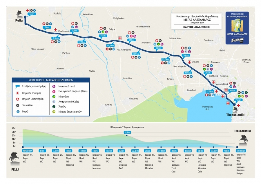 Αφετηρία στο άγαλμα του Μεγάλου Αλεξάνδρου της Πέλλας και τερματισμός της κούρσας των 42,195 χιλιομέτρων στην παραλία της Θεσσαλονίκης στη Λεωφόρο Μεγάλου Αλεξάνδρου, στο ύψος του αγάλματος του Μακεδόνα στρατηλάτη.