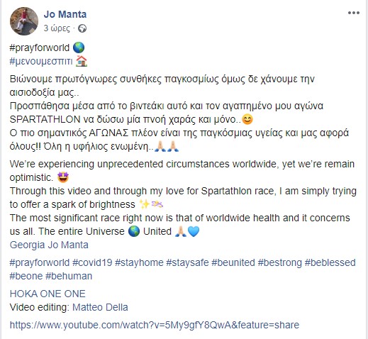 Η Σπαρταθλήτρια Τζο Μαντά, μέσα από το βίντεο που δημοσίευσε πριν λίγο στον προσωπικό της λογαριασμό στο fb, προσπαθεί όπως αναφέρει να δώσει μία πνοή χαράς και μόνο.