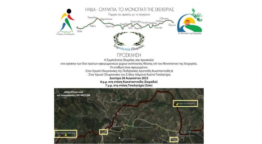 Τους χρυσούς Ολυμπιονίκες της Ποδηλασίας Αριστείδη Κωνσταντινίδη και του Στίβου (άλματα) Κώστα Τσικλητήρα, τιμά η Συμπολιτεία Ολυμπίας, εγκαινιάζοντας τους δυο πρώτους χώρους ανάπαυσης και θέασης επί της διαδρομής "Ήλιδας Ολυμπίας: Το Μονοπάτι της Εκεχειρίας", λίγο πριν το Χειμαδιό και το Σόπι, τη Δευτέρα 28 Αυγούστου 2023 στις 6 και 7 το απόγευμα αντίστοιχα.