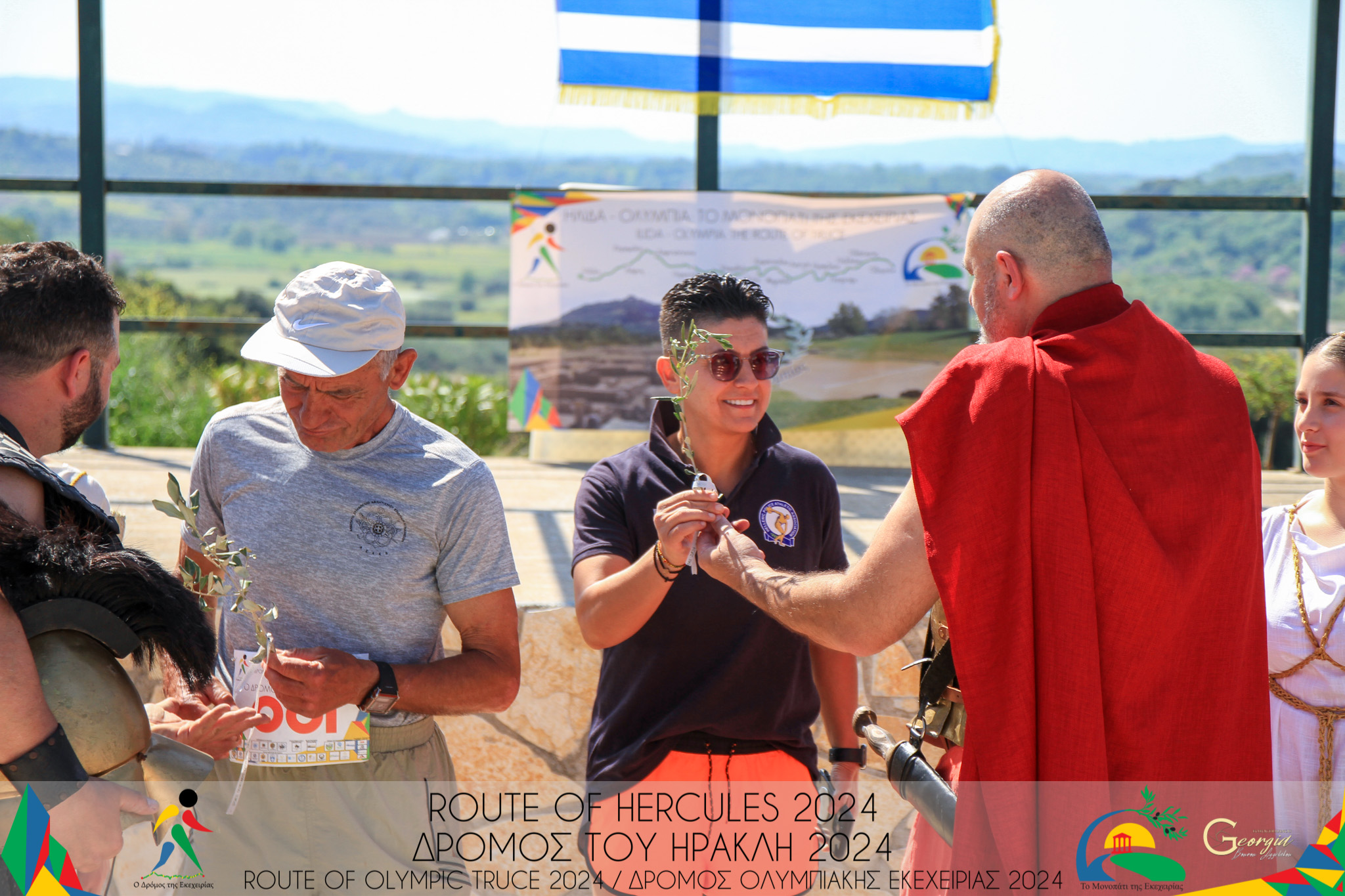 Δύο «αρχαίοι πολεμιστές» εναπόθεσαν τον οπλισμό τους μετά τη συμβολική διακοπή της διαμάχης τους από μία ιέρεια, η οποία στη συνέχεια αφού τους έδωσε ένα κλαδί αγριελιάς, χόρεψε μαζί με άλλες ιέρειες τονίζοντας τη σημασία της διακοπής των εχθροπραξιών. Οι δύο πολεμιστές με τη σειρά τους παρέδωσαν τα κλαδιά της αγριελιάς, αιώνιο σύμβολο ειρήνης αλλά και των αρχαίων Ολυμπιακών Αγώνων, στον υπερδρομέα μεγάλων αποστάσεων και σύγχρονο ημεροδρόμο Γιάννη Κούρο και στην Μαρία Καρπαθάκη, Παγκοσμιονίκη στο TAEKWONDO, πρέσβειρα του #BEACTIVE, προπονήτρια της εθνικής ομάδας TAEKWONDO Ενόπλων Δυνάμεων και Σωμάτων Ασφαλείας, δίνοντας έτσι το έναυσμα για την εκκίνηση του Δρόμου του Ηρακλή.