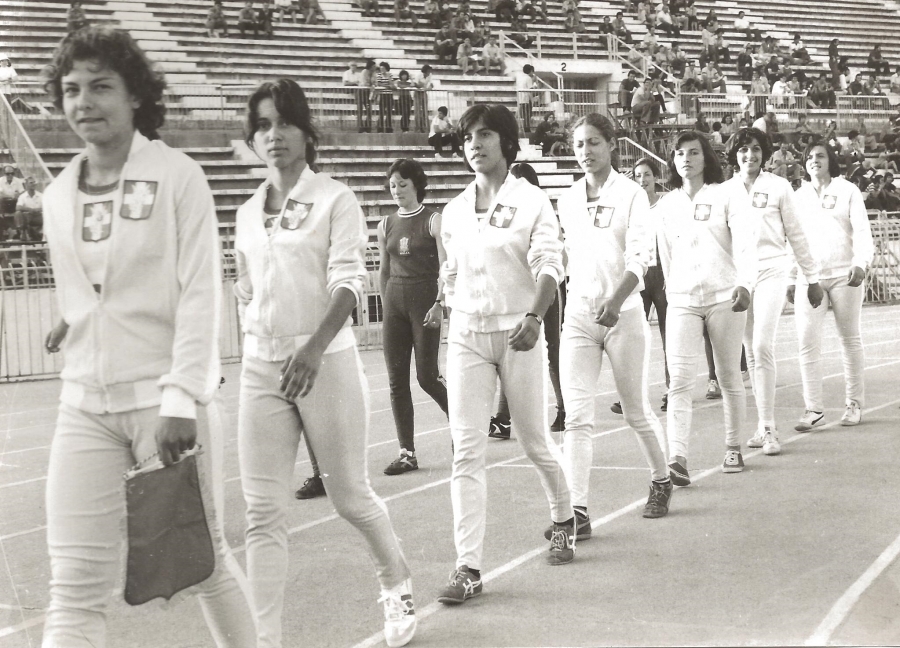 Στη φωτογραφία η Αλέκα Σιούλη, δεύτερη στη σειρά, πίσω από την ταμία του ΣΕΓΑΣ Ξένια Αργειτάκη, στην παρέλαση αγώνων με την εθνική ομάδα το 1977 στο στάδιο "Καραισκάκης"