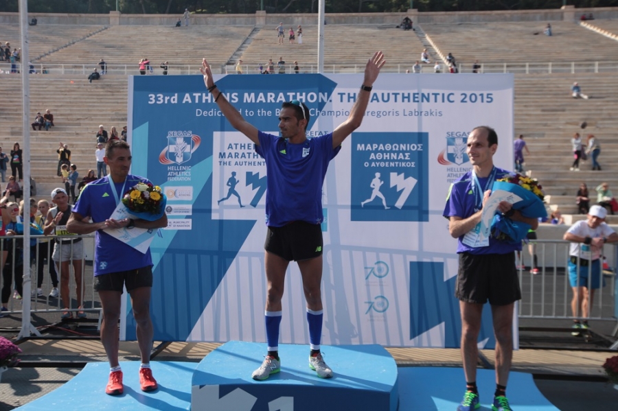 Ο έμπειρος δρομέας από την Χίο τερμάτισε σε 2 ώρες 21.22 ενάμιση περίπου μήνα από την συμμετοχή του στον Μαραθώνιο του Βερολίνου. Ο Μερούσης σημείωσε την καλύτερη επίδοση του στην κλασική διαδρομή και έδειξε πως την Ανοιξη θα είναι σε θέση να διεκδικήσει το ακόμη καλύτερες επιδόσεις. Δεύτερος όπως και το 2014 ήταν ο Δημήτρης Θεοδωρακάκος με 2.27.03, στον πρώτο αγώνα του ενόψει της προσπάθειας που θα κάνει φέτος να διεκδικήσει το όριο συμμετοχής στους Ολυμπιακούς Αγώνες του Ρίο ντε Τζανέιρο. Η πρώτη τριάδα των Ανδρών έκλεισε με τον Δήμο Ευαγγελίδη με 2.27.28.