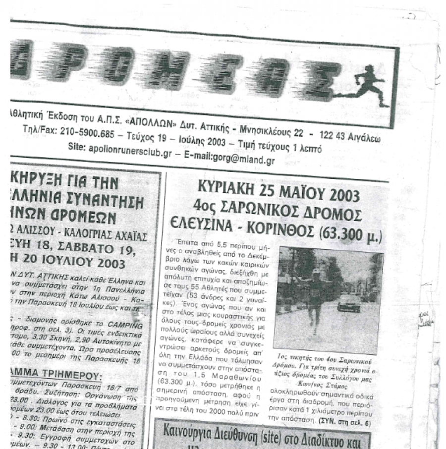 Χθες, στην καθιερωμένη εβδομαδιαία συνάντηση που κάναμε στα γραφεία μας μαζί με τα έπαθλα του Συλλόγου μας, τα μέλη έφεραν και κάποια παλιά τεύχη της εφημερίδας ΔΡΟΜΕΑΣ. Μιας εφημερίδας η οποία συνέβαλε σε μεγάλο βαθμό στην εξάπλωση του δρομικού κινήματος, αφού για πολλά χρόνια αποτέλεσε τη βασική πηγή ενημέρωσης των δρομέων ανά την Ελλάδα. Έτσι λοιπόν ξεφυλλίζοντας τις αναμνήσεις του παρελθόντος, και με αφορμή τον αγώνα του Σαρωνικού το Σάββατο 5 Δεκεμβρίου, όπου και θα λάβουν μέρος αρκετοί φίλοι - συναθλητές του Συλλόγου μας θυμηθήκαμε ότι πριν από 13 χρόνια έγινε η πρώτη ουσιαστικά αποστολή αθλητών μας σε αγώνα υπεραπόστασης. Συγκεκριμένα στις 25 Μαΐου 2003 διεξήχθη ο 4ος Σαρωνικός αγώνας δρόμου με εκκίνηση την Ελευσίνα και τερματισμό τη Κόρινθο. Μάλιστα ο αγώνας τότε ήταν συνολικής απόστασης 64.380μ ή αλλιώς όπως τον αποκαλούσαν οι διοργανωτές 40 μιλίων. Σε αυτό τον αγώνα είχαν λάβει μέρος και τερμάτισαν επιτυχώς τα ιδρυτικά μέλη του Συλλόγου μας: Συράκης Δημήτρης, Γούλας Νίκος και Κουζελέας Δημήτρης. Μάλιστα οι Συράκης Δημήτρης και Κουζελέας Δημήτρης, μετά από αυτή τη μοναδική εμπειρία, έλαβαν μέρος επιτυχώς και σε άλλους αγώνες υπεραπόστασης τόσο στην Ελλάδα όσο και στο εξωτερικό, δημιουργώντας ουσιαστικά μια παράδοση για το Σύλλογό μας και στις υπεραποστάσεις.