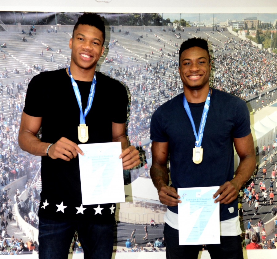 Οι αδελφοί Αντετοκούνμπο υπέγραψαν αίτηση συμμετοχής, παρέλαβαν το αναμνηστικό μετάλλιο των 2.500 χρόνων από τη μάχη του Μαραθώνα το οποίο έχει εκδοθεί σε πολύ περιορισμένα αντίτυπα και δίνεται μόνο σε ανθρώπους με εξαιρετική προσφορά στον αθλητισμό, τη νεολαία και το κοινωνικό σύνολο καθώς και διάφορα αναμνηστικά του θεσμού.