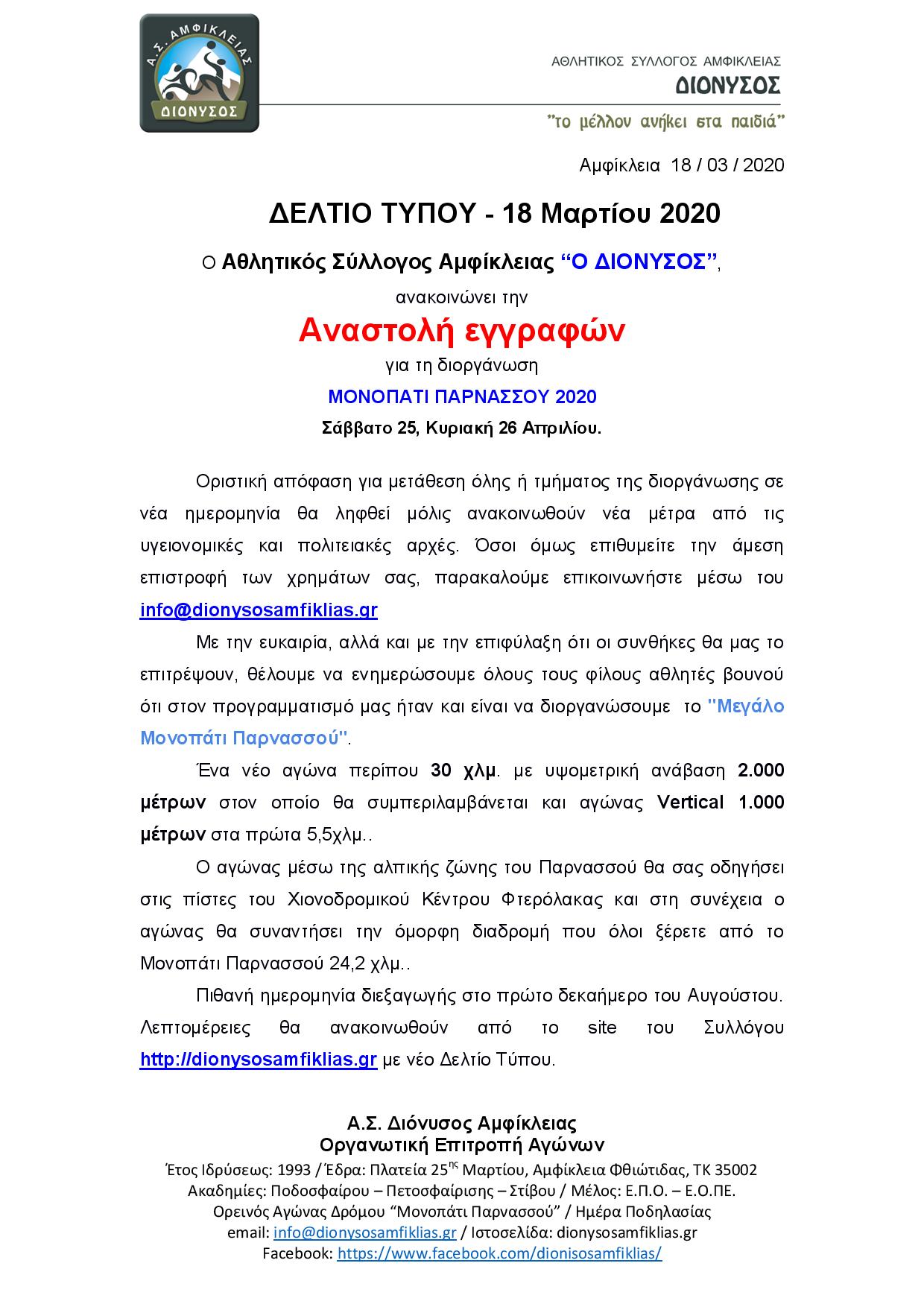 Η οργανωτική επιτροπή του Μαραθωνίου Μεσσήνης συνεκτιμώντας τις τελευταίες εξελίξεις της πανδημίας του COVID 19 και τις προτάσεις των υπηρεσιών δημόσιας υγείας σχετικών με τη μείωσης της εξάπλωσης της ασθένειας οι οποίες άμεσα σχετίζονται όχι μόνο με την υγεία και ασφαλή άθληση, που είναι κυρίαρχος σκοπός τέτοιων εκδηλώσεων, αλλά και την υγεία του υπόλοιπου πληθυσμού, ανακοινώνει την ακύρωση για το 2020 του 15ου Μαραθωνίου Μεσσήνης και των παράλληλων αγώνων 10 και 3km και δίνει ραντεβού στους φίλους δρομείς για τον Μάρτιο του 2021 σε ημερομηνία που θα ανακοινωθεί σύντομα.